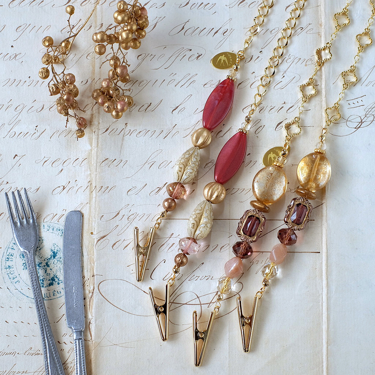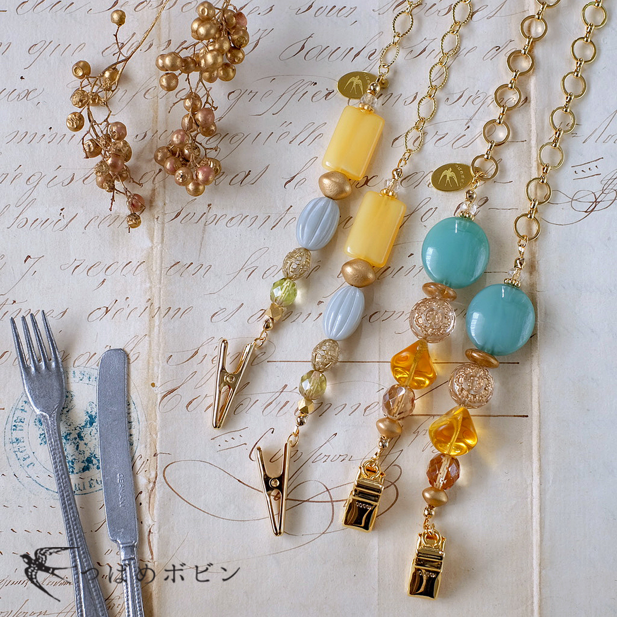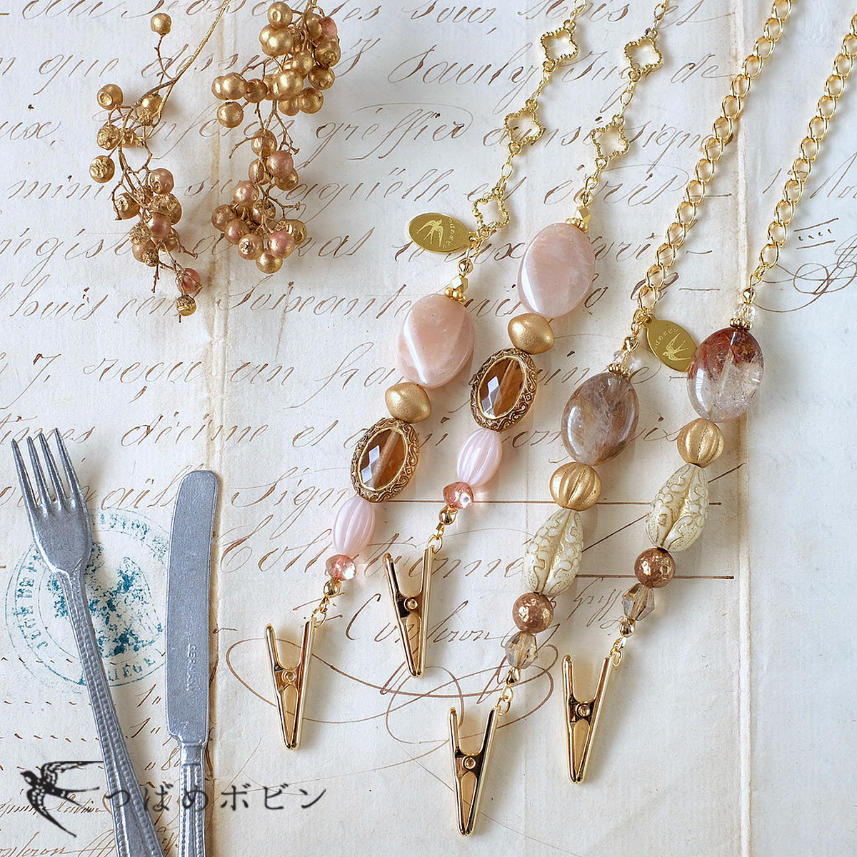 つばめボビンのナプキンクリップは、ひとつひとつがその時々の気持ちとパーツでコラージュする、原則一点もの。