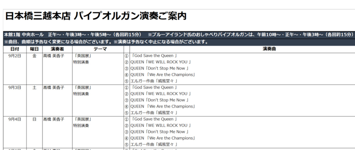 会期中、演奏を聴けるのは、9/2(金)・3(土)・4(日)の正午〜、午后3時〜、午后5時〜の3回ずつ。各回約15分間だそうです。
